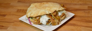 Pronto Döner Tasche ist belegt mit Kalbfleisch Döner mit Blattsalat, Tzatziki, Zwiebeln, Tomaten, Gurken im selbstgebackenen Spezial-Fladenbrot.