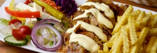Hollandaise Döner Teller ist belegt mit Kalbfleisch Döner mit Pommes Frittes und Sauce Hollandaisesauce.