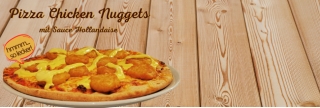 Sauce Hollandaise-Nuggets ø 24 cm ist belegt mit mit Sauce hollandaise sauce und Chicken Nuggets.