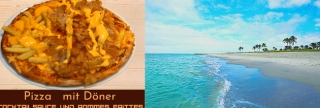 e41. Cocktail Döner Pommes Pizza NEU ø 24 cm ist belegt mit mit Cocktail Sauce ,Pommes Frietes, Dönerfleisch.